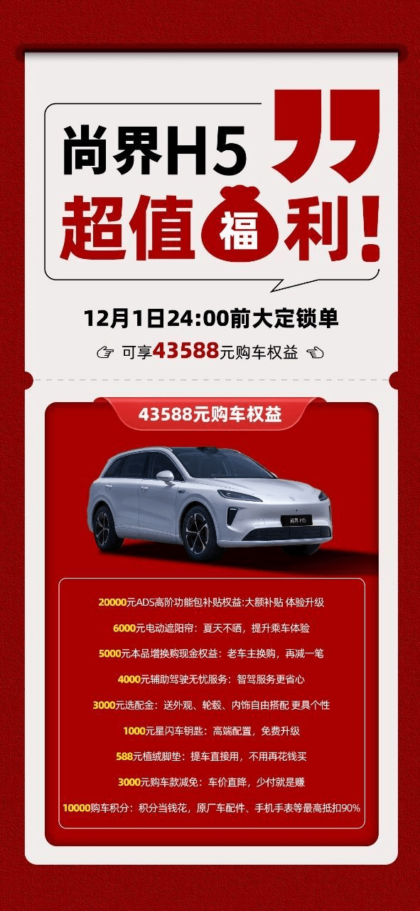 可以说,尚界H5的“华为全家桶”核心价值就在能够通过 “科技平权” 的方式,让更广泛的消费者能以亲民的价格,享受到行业第一梯队水平的辅助驾驶和智能座舱体验。而截至12月1日的限时权益,让尚界H5的性价比达到空前高度。43588元的综合权益意味着你用15万级的预算,实现了智能满配体验。