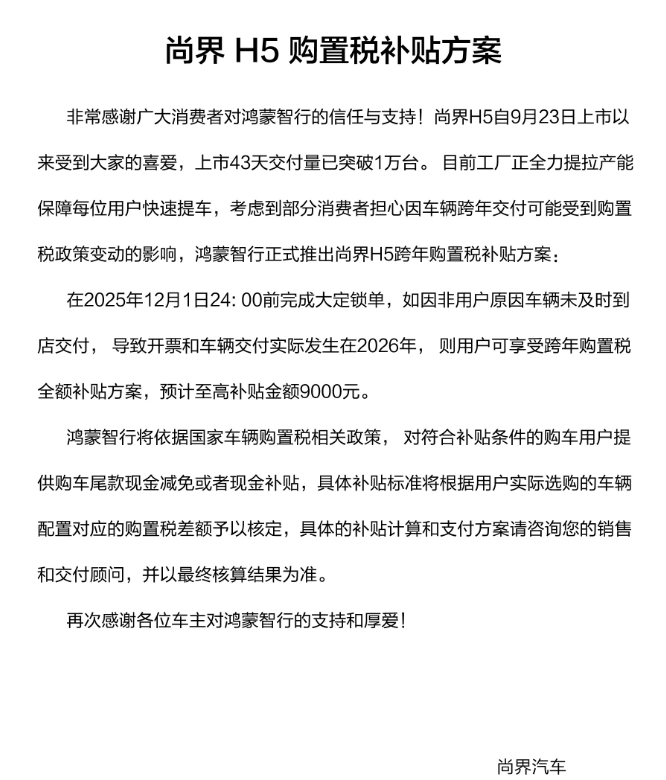此外,尚界还推出9000元购置税全额补贴兜底方案,需要说明的是尚界目前交付速度还是很快的,这一政策更多是解决了用户对购置税政策退坡的顾虑,可以放心下单。